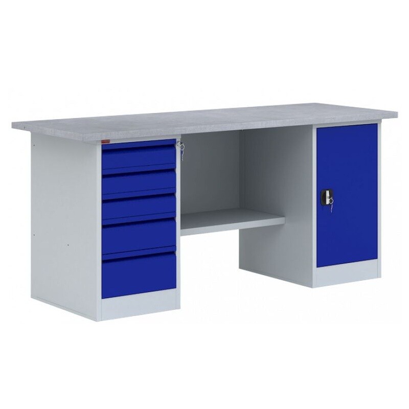 Верстак ВП-4т состоит из отдельных модулей: столешница из МДФ, покрытая оцинкованным листовым металлом, стенка задняя – металлическая, тумба с двумя съемными полками (нагрузка до 30 кг) и дверью запирающейся замком, тумба с 5-ю выдвижными ящиками на телескопических направляющих (нагрузка до 30 кг) запирающимися на центральный замок, полка верстачная (нагрузка до 40 кг).