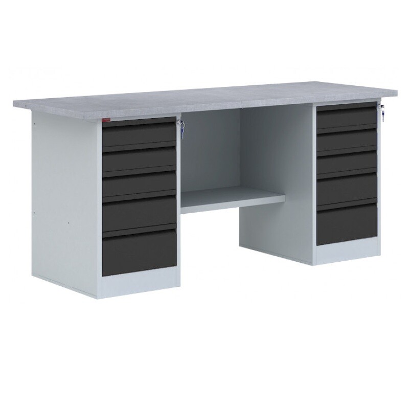 Верстак состоит из отдельных модулей: столешница из МДФ, покрытая оцинкованным листовым металлом; стенка задняя металлическая; две тумбы с 5-ю выдвижными ящиками на телескопических направляющих (нагрузка 30 кг) запирающимися на центральный замок; полка верстачная (нагрузка 40 кг).