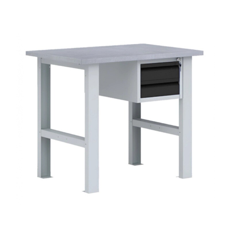 Верстак ВП-Э состоит из отдельных модулей: столешница из МДФ, покрытая оцинкованным листовым металлом; две металлические верстачные опоры; одна подвесная тумба (нагрузка до 30 кг на каждый ящик).