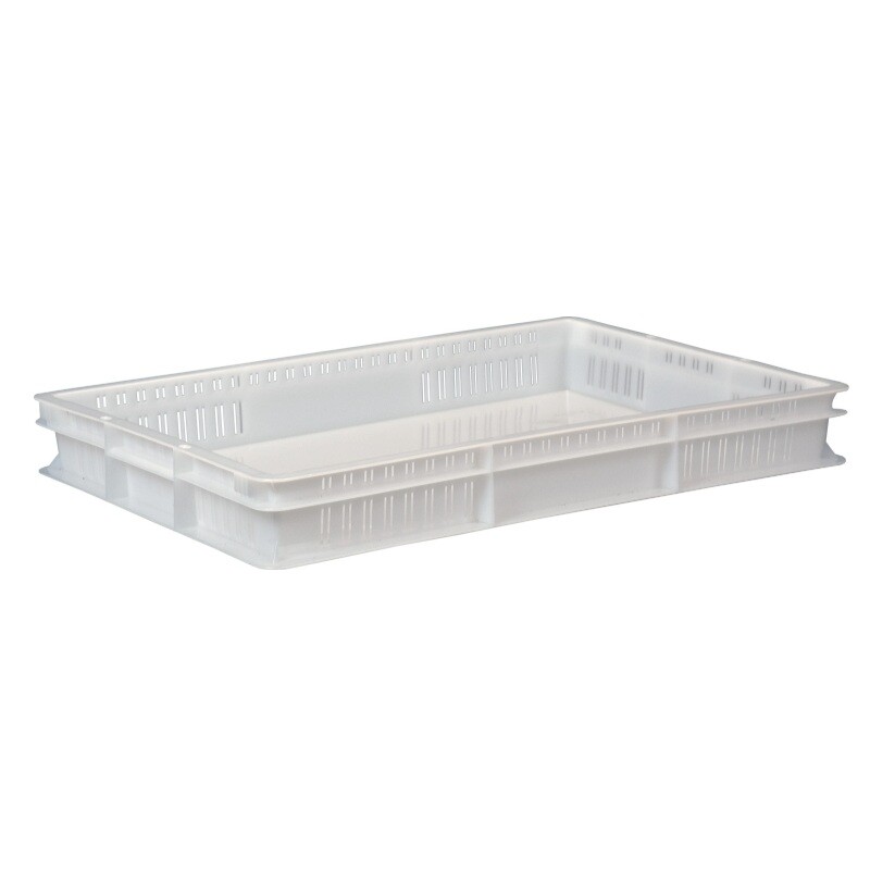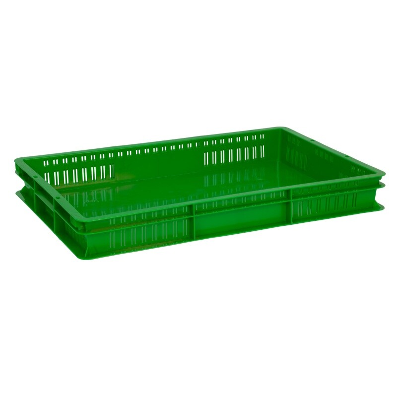 Модель оснащена перфорированными стенками и сплошным дном, что делает её идеальной для продуктов, требующих вентиляции. Благодаря невысокой высоте всего 75 мм, ящик отлично подходит в качестве поддона или основы под другую тару. Штабелируется как с крышкой, так и без неё.