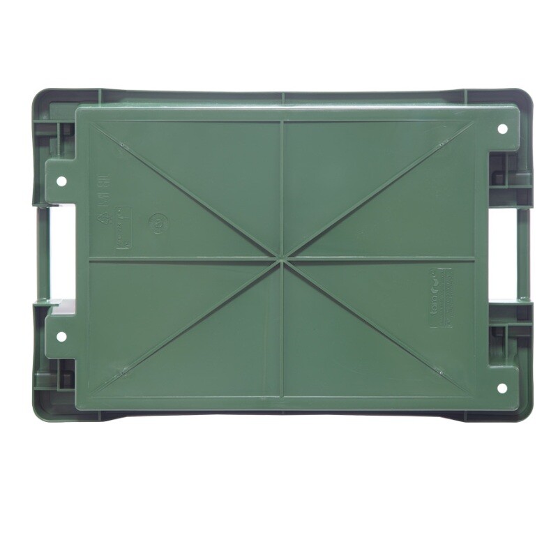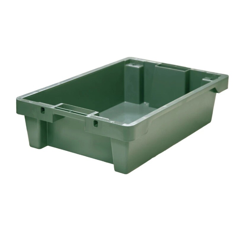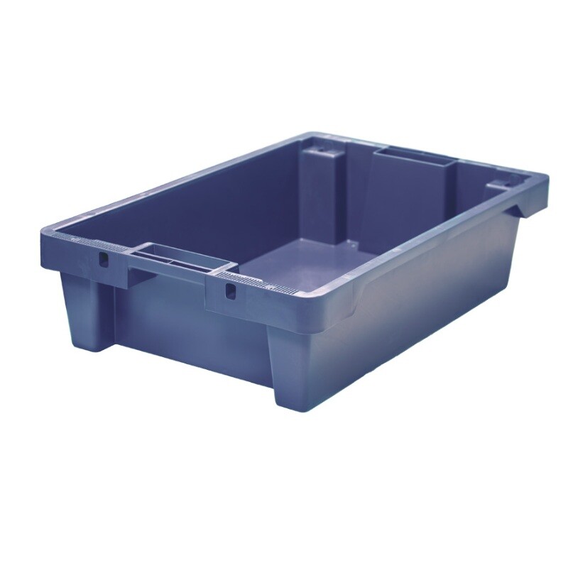 - Штабелируемый и вкладываемый: удобно хранить в стопке, при повороте на 180° пустые ящики можно вложить друг в друга, экономя до 60% пространства.