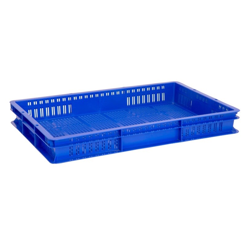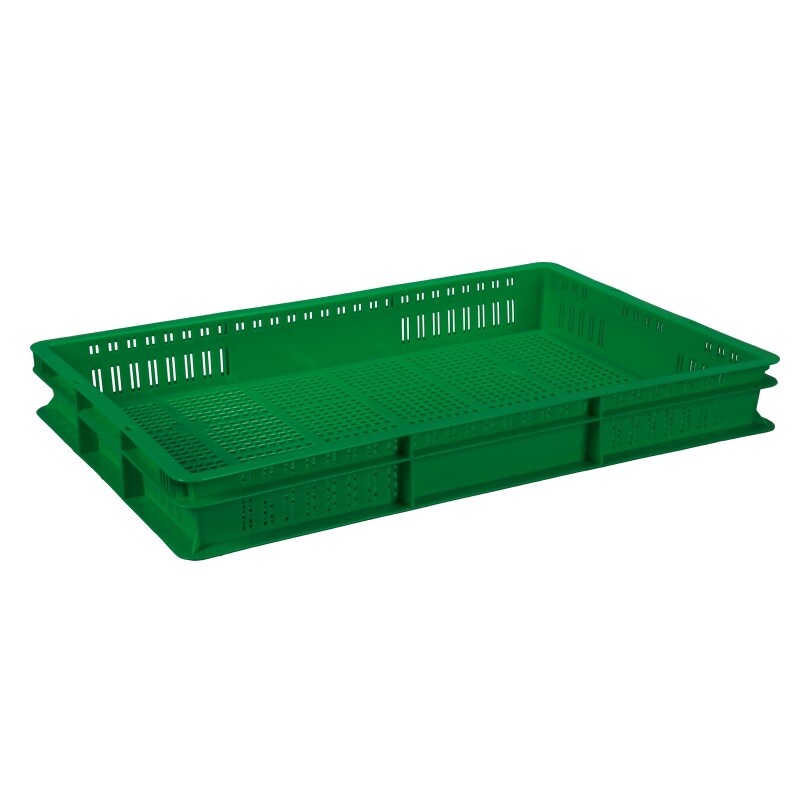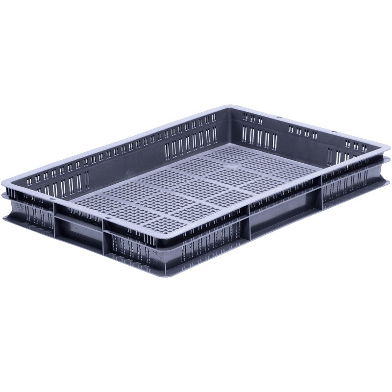 Модель оснащена перфорированными стенками и перфорированным дном, что делает её идеальной для продуктов, требующих вентиляции. Благодаря невысокой высоте всего 75 мм, ящик отлично подходит в качестве поддона или основы под другую тару. Штабелируется как с крышкой, так и без неё.